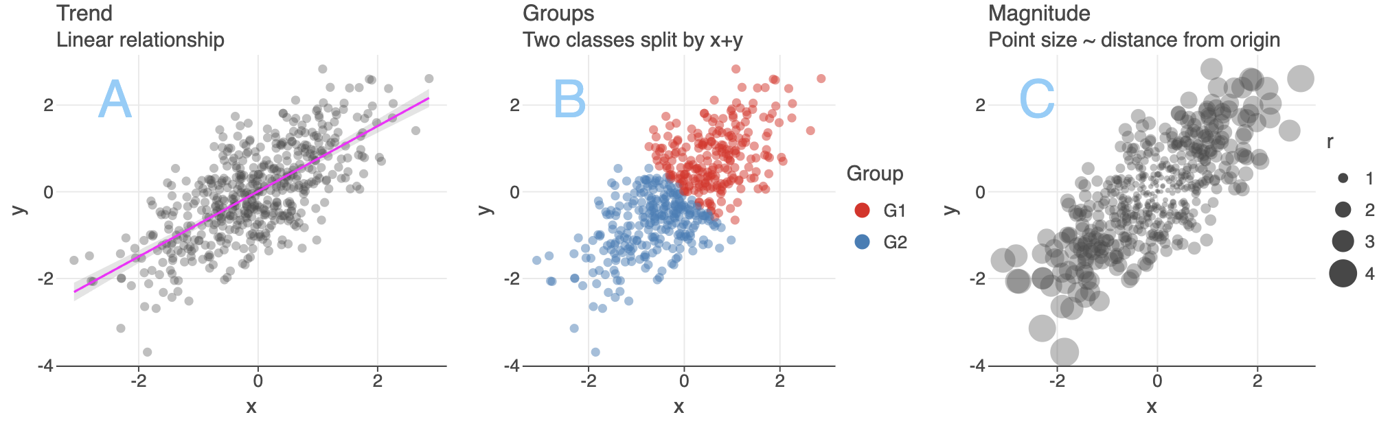 geom_smooth()layer now includes alabelsparameter designed to display statistical summaries of the fitted model directly on the plot. This parameter accepts asmooth_labels()object, which provides access to model-specific variables like \(R^2\) and the regression equation.
